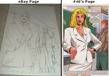 An interesting find on eBay: an alternate version of Generation X #46's first page. It's still drawn by Arron Lopresti and still has Emma and Banshee, but look at how different their poses are. Banshee is rubbing his neck rather than straightening his tie. You can see Emma's bra. Emma's holding up a finger rather than her entire hand. And even the background is different. So why was it replaced? Who knows. It was obviously replaced early on, though, since the page on eBay never got inked. To see the auction, click here. ![]()