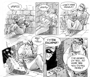 Also, Alex Saviuk, who helped Eisner pencil the story, replied to an e-mail I sent him yesterday about the story. "I looked on the calendar this morning and realized that this Monday morning a week ago WILL was still in the hospital waiting to go home on Tuesday," he wrote. He added that the Spirit drawing featured with yesterday's news-bit will be auctioned on eBay this Thursday night on a 10-day listing with al proceeds going directly to the American Cancer Society. Saviuk also hopes to work on future Escapist stories. "I am also hoping that with the publication of this new work, I might possibly get the opportunity to do an ESCAPIST story on my own," he said. "[I] know that WILL (with his customary generosity) wanted to introduce me to [Dark Horse] by having me work on this story with him." THE FINAL EISNER STORY: ESCAPIST/SPIRIT CROSSOVER!