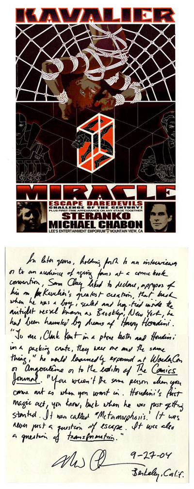 The piece Chabon contributed features the first paragraph of The Amazing Adventures of Kavalier & Clay, as scribed by Chabon himself. The passage comes on a rare poster for the first encounter of Chabon and Jim Steranko at Lee's Comics in Mountain View, California in December 2002.